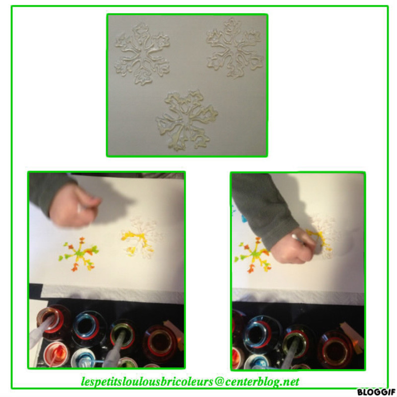 Anaëlle a utilisé les flocons de neige réalisés au pistolet à colle comme pochoir et avec des cotons tiges et de l'encre a réalisé de beaux flocons...