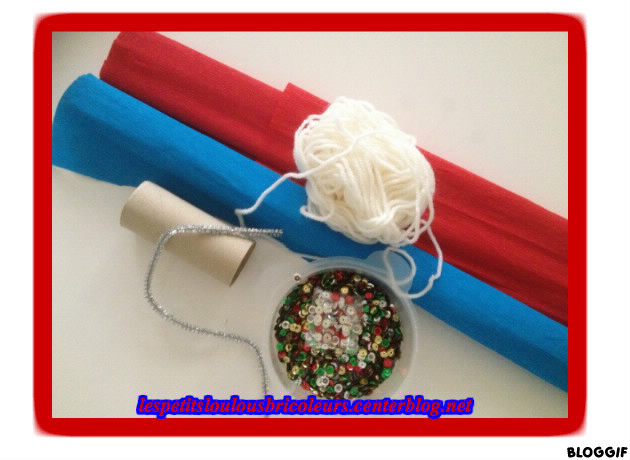 Un rouleau de papier toilette, du papier crépon rouge et bleu, de la laine blanche, un cure-pipe, de la colle et des sequins.