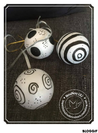 Il ne faut pas beaucoup de matériel, juste des boules de polystyrène blanches (il reste toujours des boules de noël chez nous), un feutre noir, un élastique ou une ficèle ou un ruban, un peu de colle ou colle chaude...